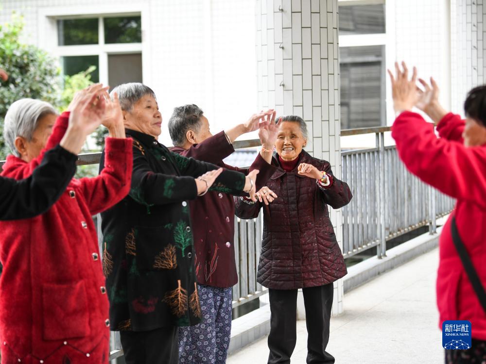 10月20日,在四川省眉山市彭山區社會福利院,趙鳳章老奶奶(右二)和福利院其他老人一起學做手指操。