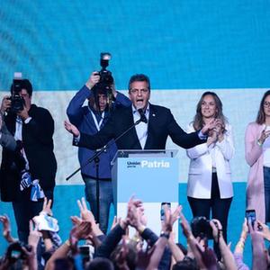 10月22日,阿根廷中左翼執政聯盟祖國聯盟候選人、現任經濟部長塞爾希奧·馬薩(中)在位于首都布宜諾斯艾利斯的競選總部發表演說。
