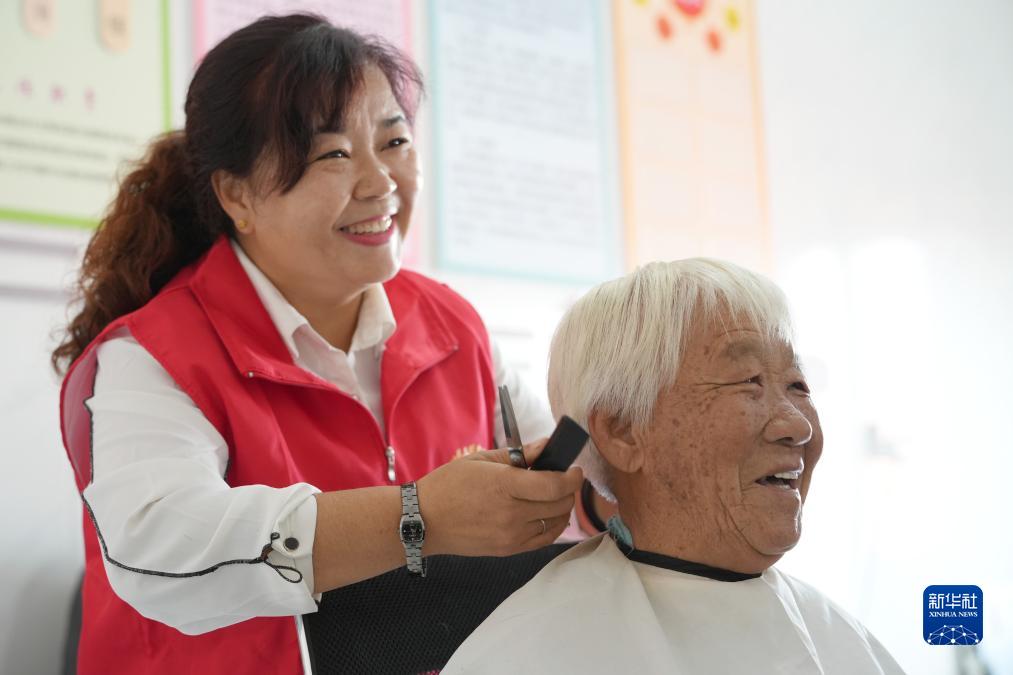 10月23日,志愿者在河北省石家莊市鹿泉區段莊村為老人理發。