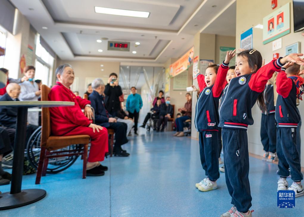 10月23日,在江蘇省興化市昭陽湖幼兒園,小朋友給老人們表演節目。