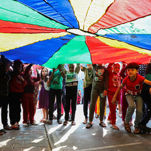10月23日,在加沙地帶南部,流離失所的兒童在聯合國近東巴勒斯坦難民救濟和工程處一所附屬學校內做游戲。