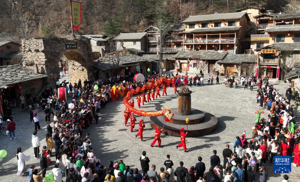 游客在朱家灣村終南山寨民俗文化村觀看舞龍表演(3月4日攝,無人機照片)。