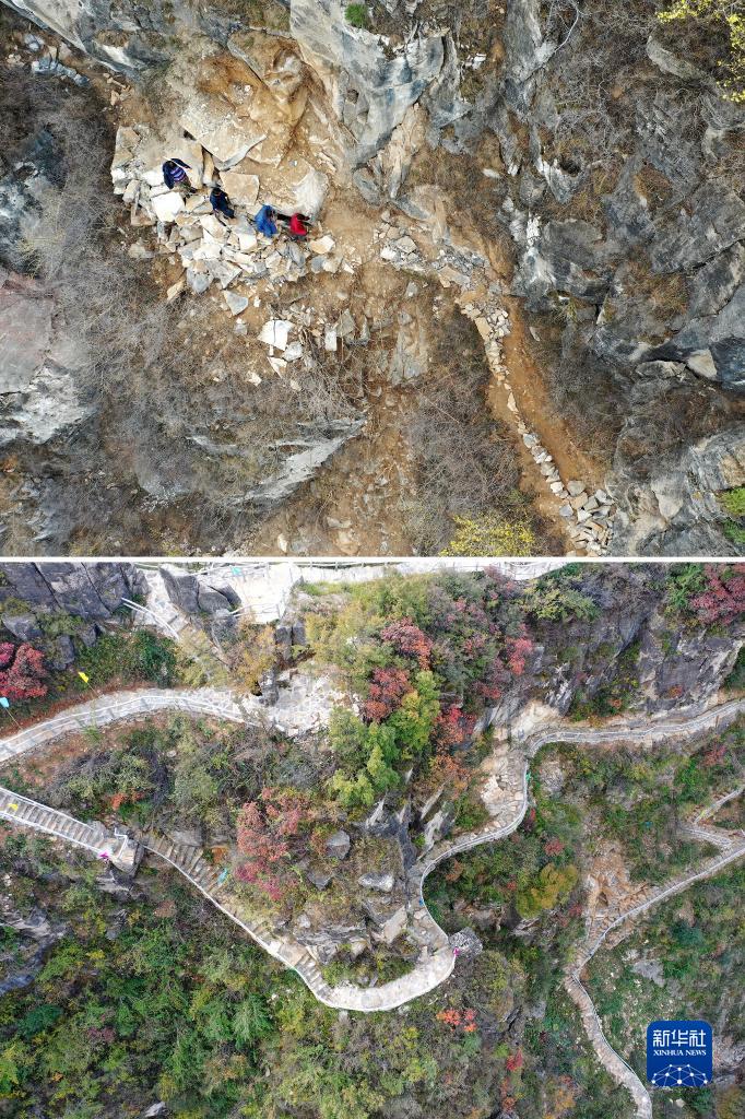 拼版照片:上圖為在壺關縣大峽谷鎮青龍峽村,村民們在山上修路(3月23日攝,無人機照片);下圖為修好的旅游步道(10月18日攝,無人機照片)。