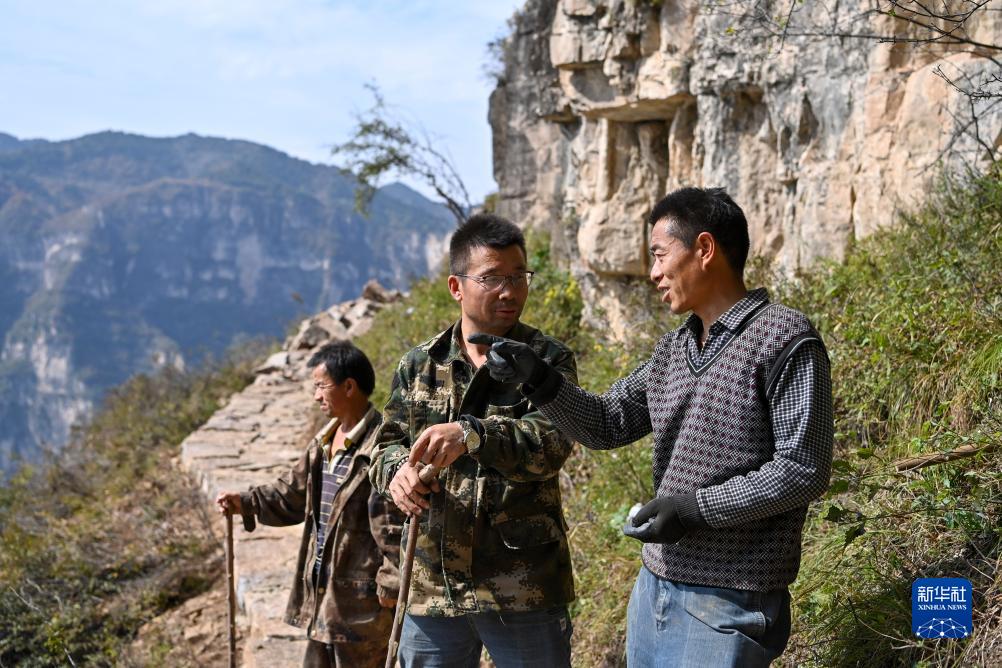 牛何松(右)向經過的村民們描繪修通絕壁棧道帶來的觀光體驗(10月17日攝)。