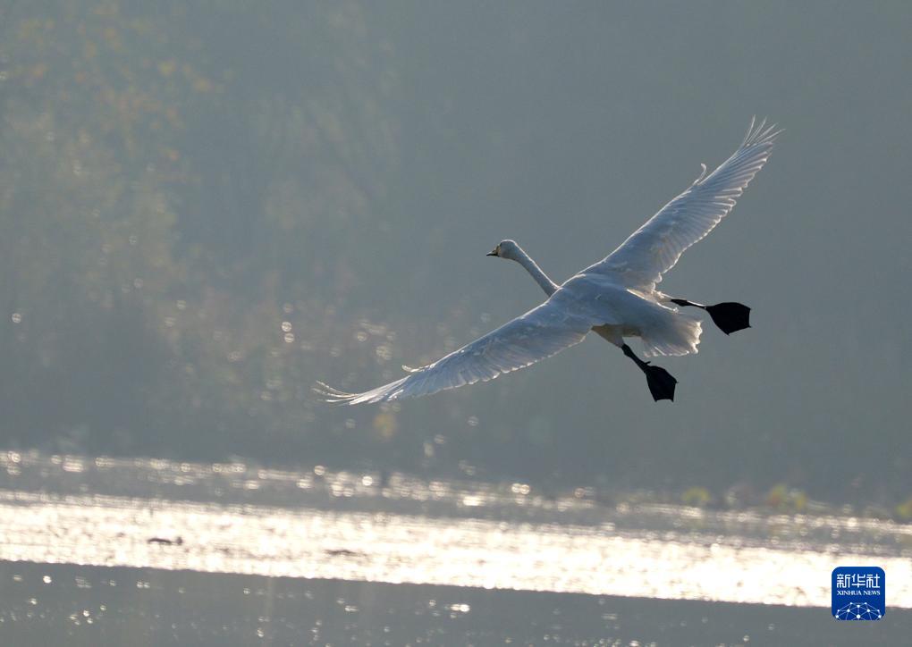 10月24日,大天鵝在三門峽市天鵝湖國家城市濕地公園內飛翔。