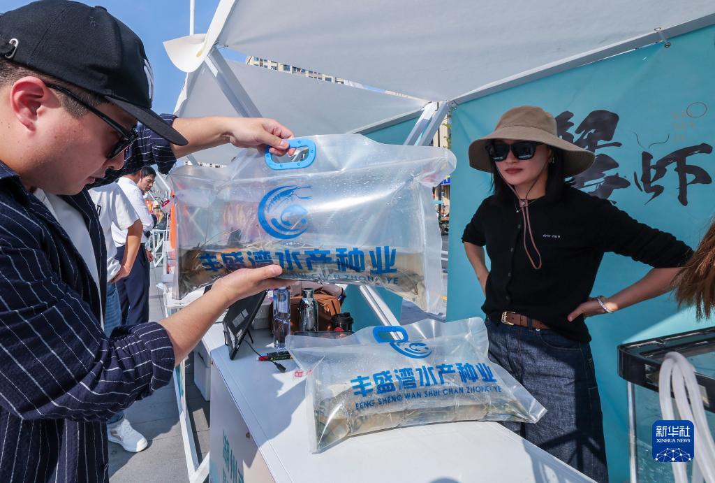 10月24日,游客在湖州市織里鎮豐收節現場的農特產品嘉年華集市上選購沼蝦。