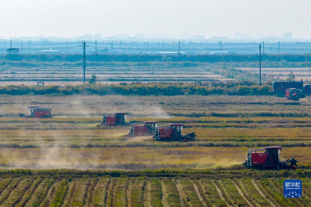 10月24日,收割機在浙江省余姚市濱?,F代農業先導區收割晚稻(無人機照片)。