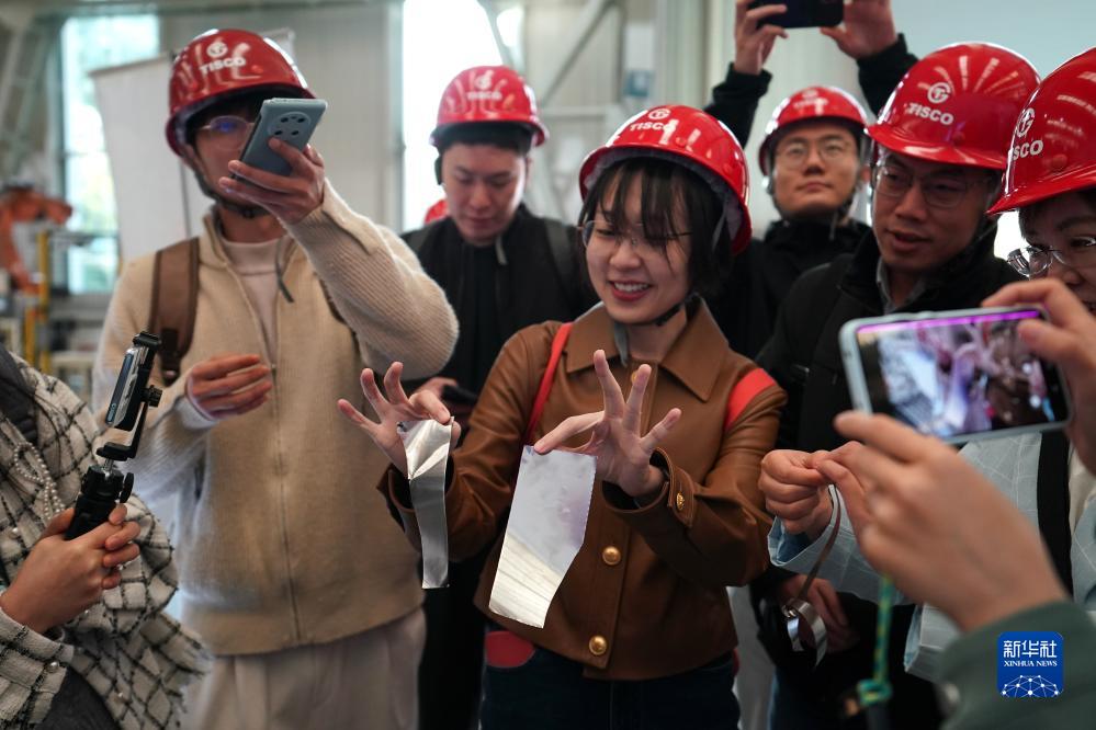 10月24日,參觀者在中國寶武山西太鋼不銹鋼精密帶鋼有限公司車間展示“手撕鋼”。