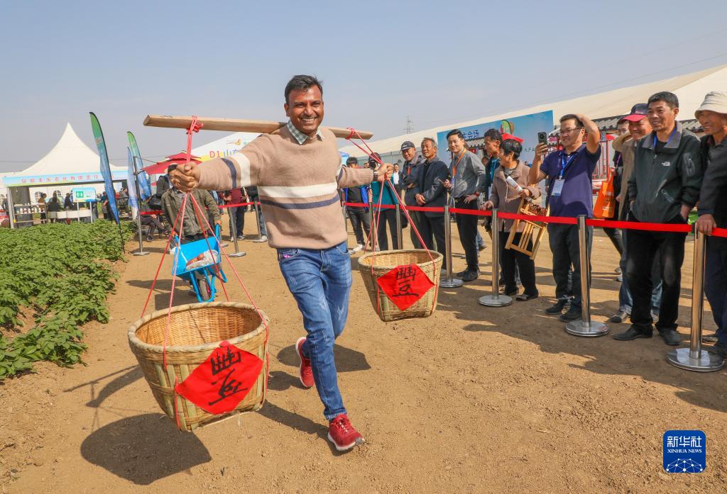 10月23日,在山東省滕州市大塢鎮展會現場,一名國外參展商參加馬鈴薯豐收慶?;顒?。