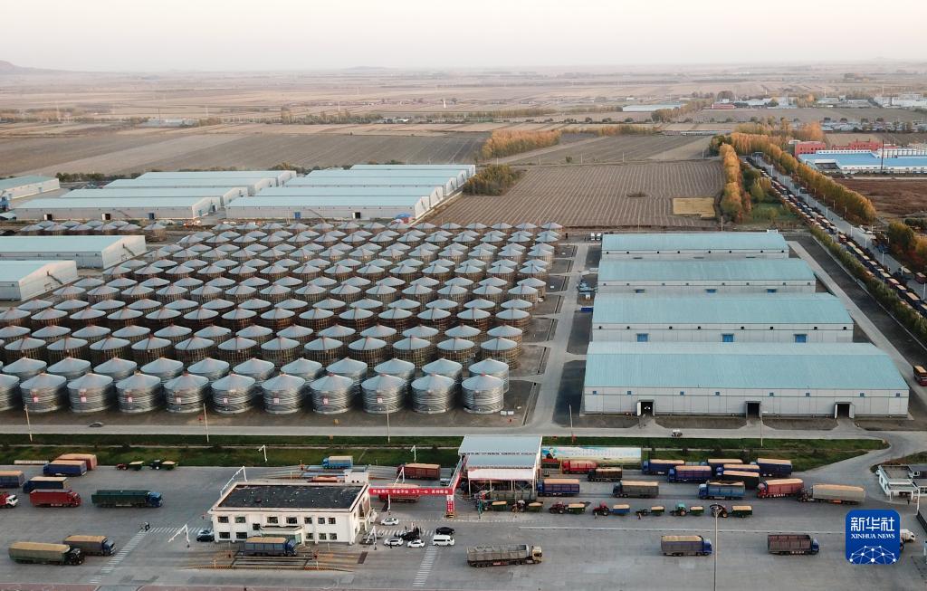 這是10月11日拍攝的送糧車在富錦市一大型糧食倉儲加工企業內排隊賣糧(無人機照片)。