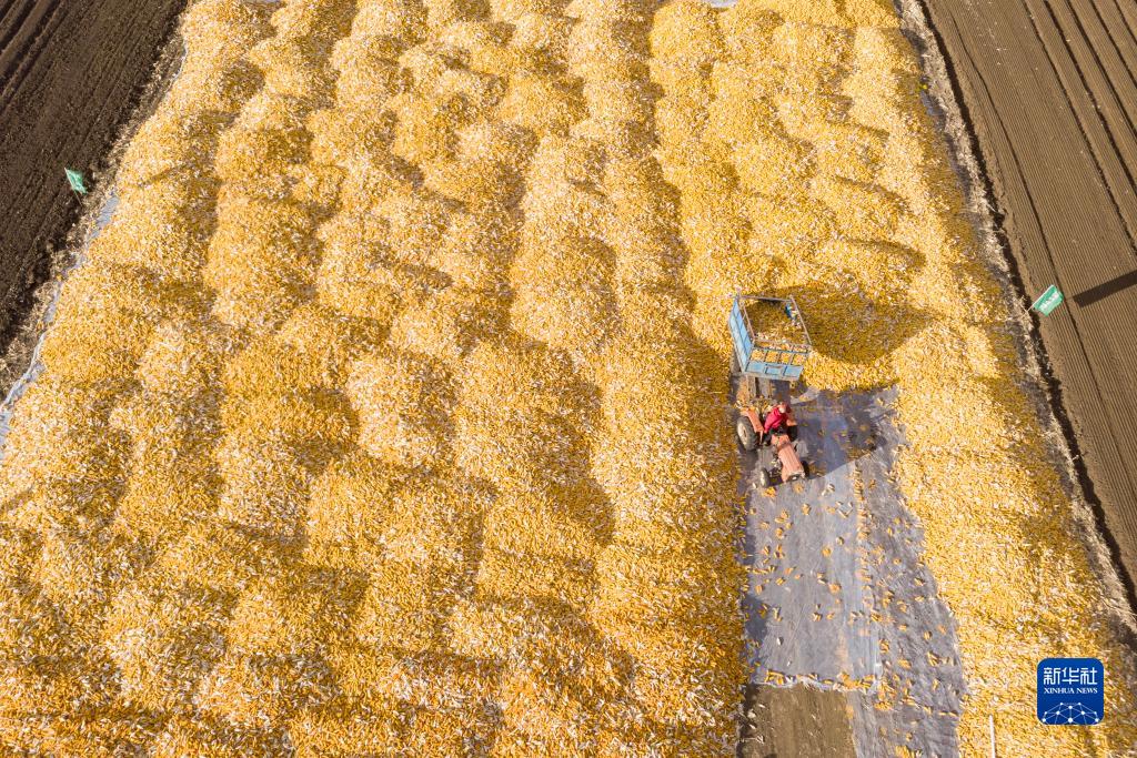 10月19日,在黑龍江省肇東市五里明鎮東升村,農民把收獲的玉米運到當地農業合作社指定的地點進行晾曬(無人機照片)。