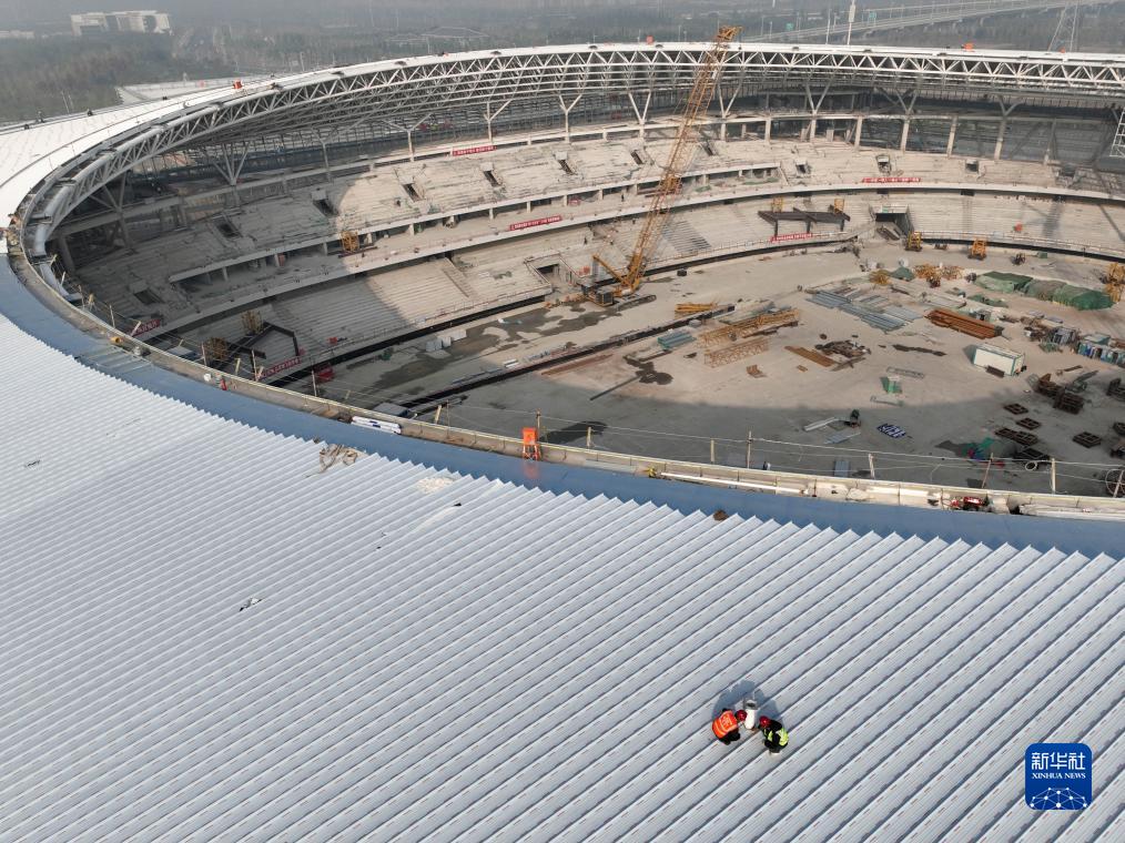 工人在雄安體育中心體育場施工(10月24日攝,無人機照片)。