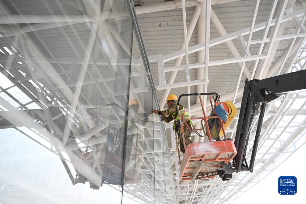 工人在雄安體育中心體育場施工(10月24日攝)。