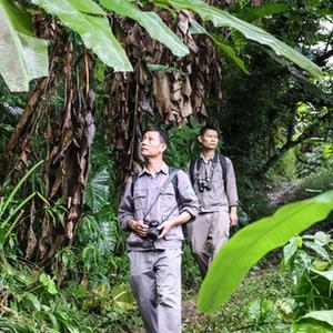 10月18日,海南長臂猿監測隊隊員李文永(左)和同事在海南熱帶雨林國家公園霸王嶺片區進行監測工作。