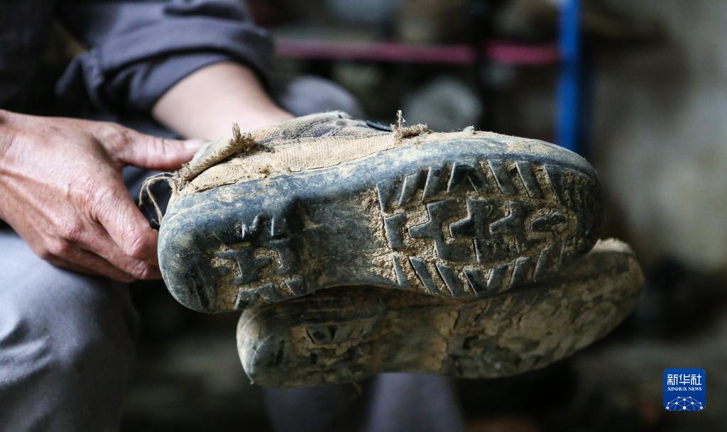 10月18日,海南長臂猿監測隊隊員李文永展示一雙因長期上山而穿爛的鞋。