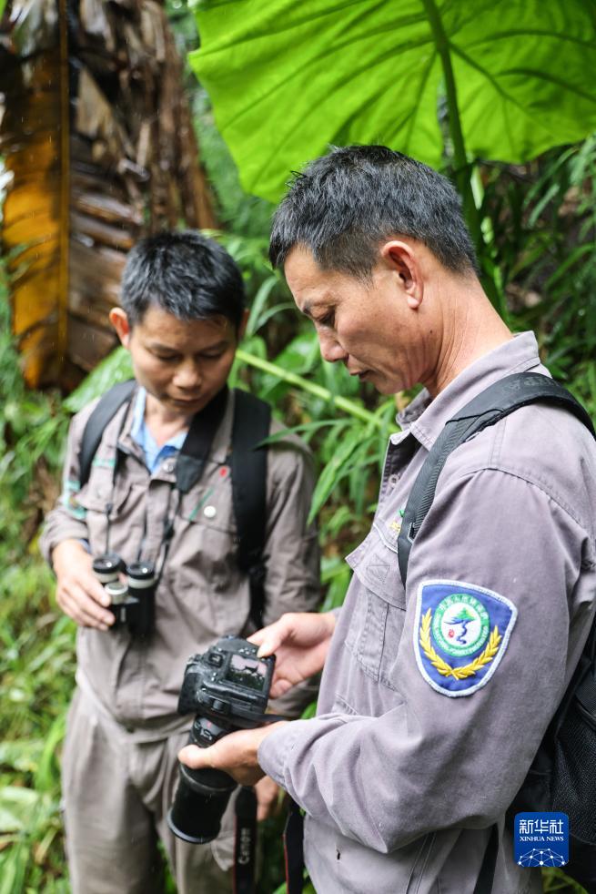 10月18日,海南長臂猿監測隊隊員李文永(右)和同事在海南熱帶雨林國家公園霸王嶺片區查看幾天前拍攝的照片。