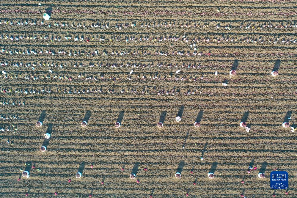 10月24日,寶豐縣周莊鎮西黃村村民在收獲紅薯(無人機照片)。