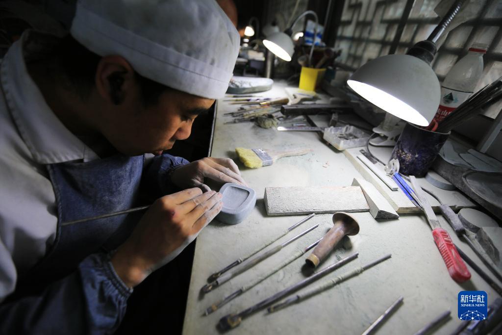10月24日,藝人在甘肅省定西市臨洮縣洮硯藝術館雕刻制作洮硯。