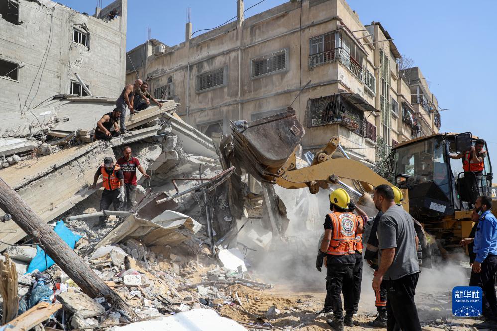 10月24日,在加沙地帶南部城市汗尤尼斯,人們在遭以色列襲擊的建筑廢墟中搜救。