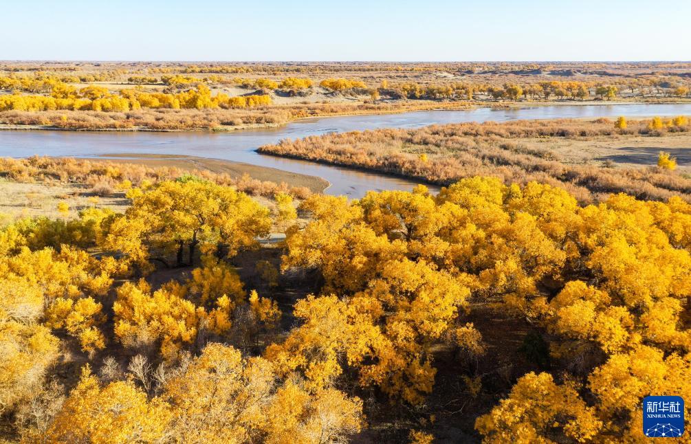 金秋時節,內蒙古自治區阿拉善盟額濟納旗的胡楊林披上“金裝”。