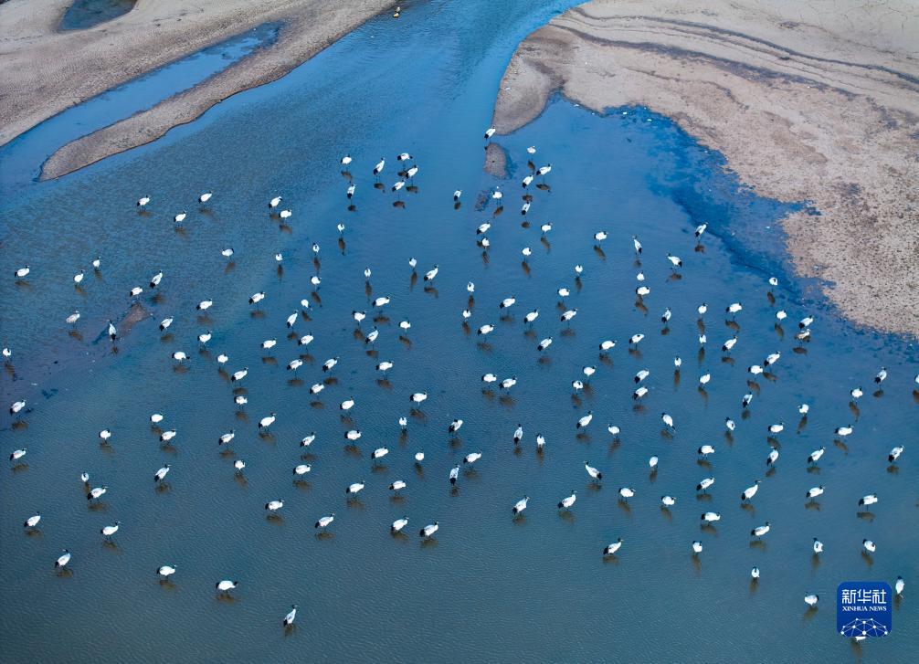 這是在拉薩市林周縣虎頭山水庫拍攝的越冬黑頸鶴(10月24日攝,無人機照片)。