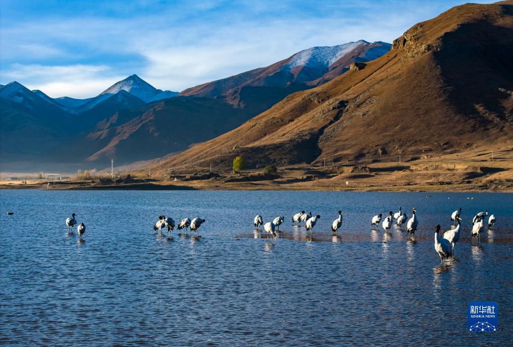 10月下旬,西藏自治區拉薩市林周縣迎來2023年第一批越冬黑頸鶴。它們將在這里一直待到來年三四月份。黑頸鶴是國家一級保護動物,主要棲息在海拔2500米至5000米的高原、草甸、沼澤地帶。拉薩北部的林周縣平均海拔約4200米,是黑頸鶴的主要越冬地之一。