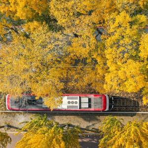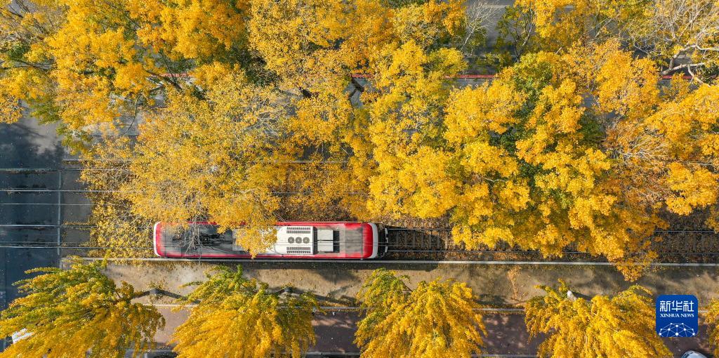 10月24日,一輛電車行駛在長春市春城大街(無人機照片)。