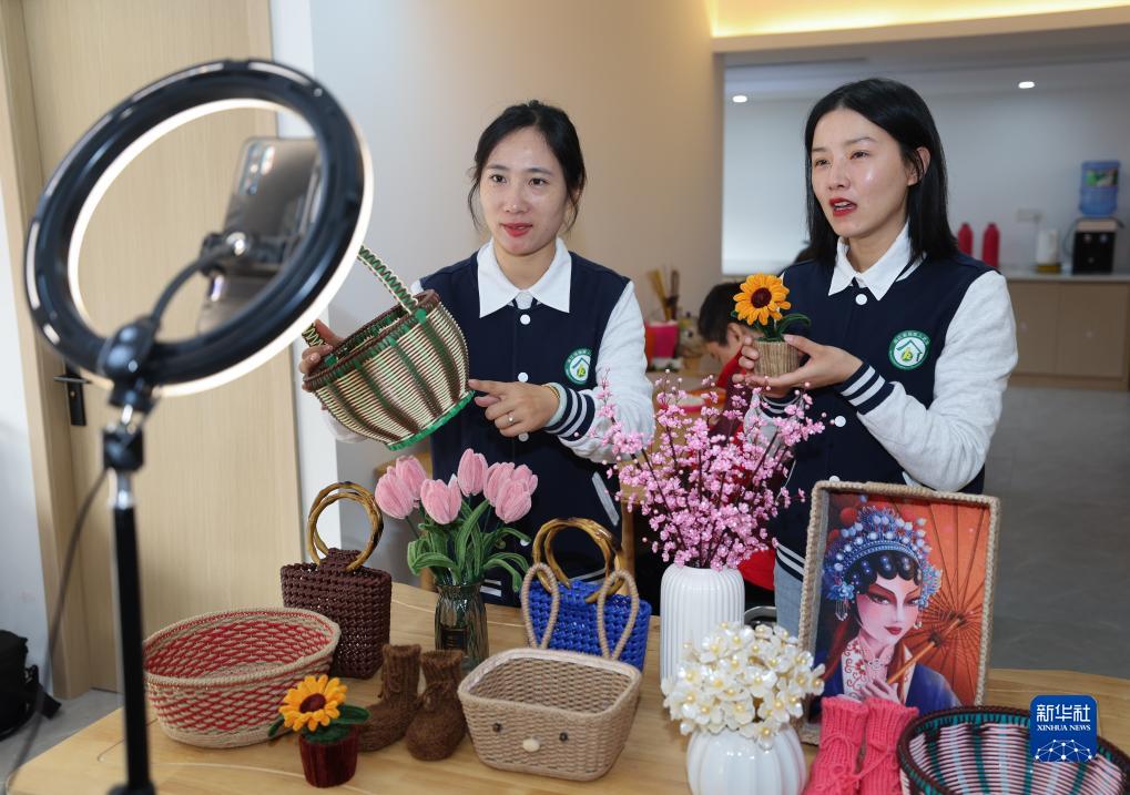 10月25日,黨員志愿者在杭州市臨安區玲瓏街道玲溪社區黨群服務中心共富工坊直播售賣工坊里制作的手工藝品。該工坊提供輕強度手工的輔助性就業崗位,目前已有46名殘疾人在這里實現家門口就業。