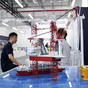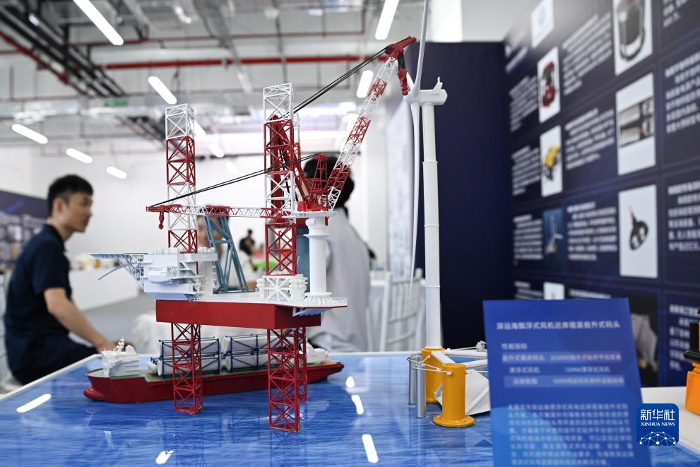 在深海先進技術與裝備展覽上展出的深遠海漂浮式風機近岸組裝自升式碼頭(10月25日攝)。