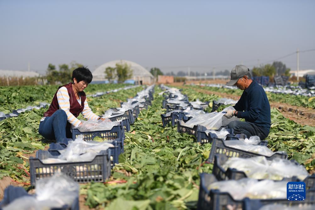 10月25日,辛集市辛集鎮辛洲蔬菜種植基地的工人在打包蘿卜。該基地種植的蘿卜按訂單銷往日本。