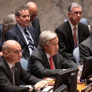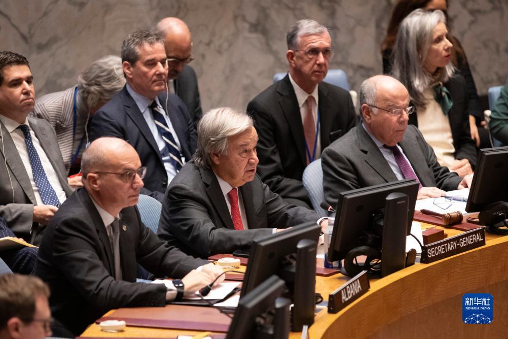 10月24日,在位于紐約的聯合國總部,聯合國秘書長古特雷斯(前中)在安理會巴以局勢高級別會議上講話。