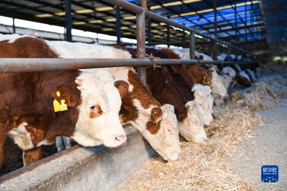 10月23日,重慶市豐都縣高家鎮厚池壩村肉牛育肥場的肉牛在進食。