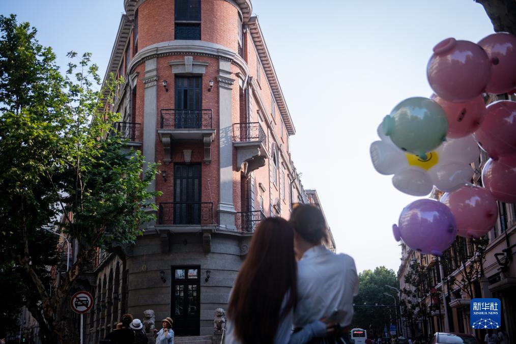 游客在武漢市漢口歷史風貌區巴公房子前拍照(2023年6月6日攝)。隨著漢口歷史風貌區舊城改造城市更新項目的推進,風貌區內一座座老建筑被修繕、改造,融入現代生活,煥發新的生命。