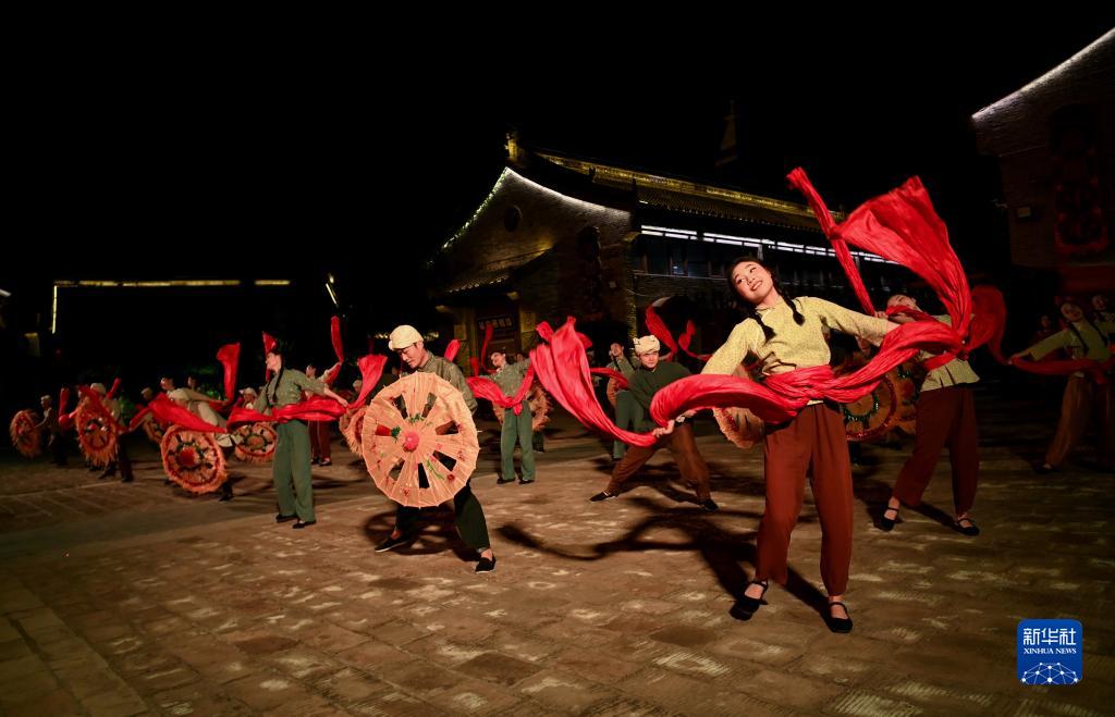 演員在陜西延安的金延安文化旅游產業園區表演紅色歌舞劇《延安十三年》(2023年8月31日攝)。大型紅色沉浸式歌舞劇《延安十三年》復原了上世紀三四十年代延安街景,選取當時典型人物和故事,通過技術創新手法和行進式表演為觀眾帶來沉浸式的紅色文化體驗。