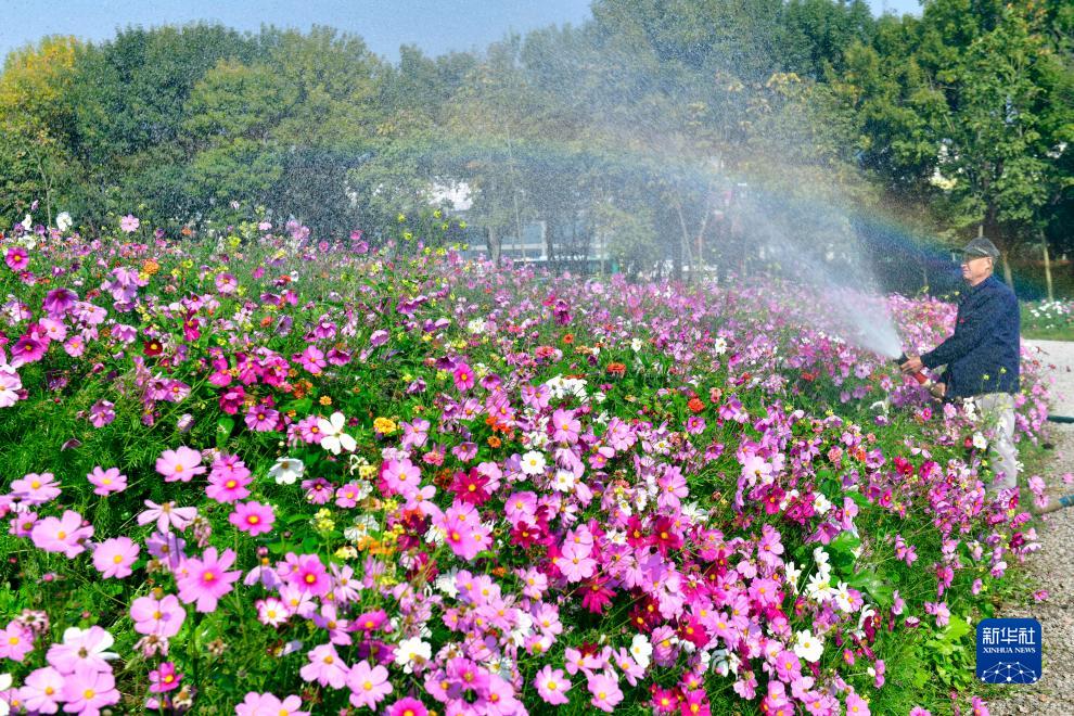 10月25日,工作人員在養護日照市東港區碳匯花海。