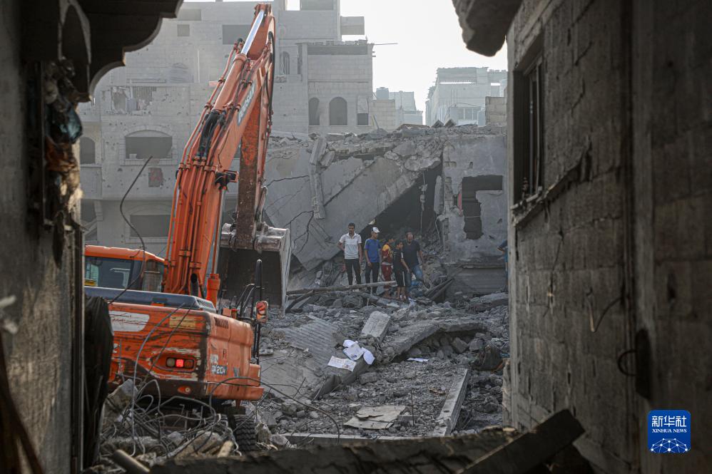 10月25日,在加沙地帶南部城市汗尤尼斯,挖掘機在以色列空襲后的建筑廢墟現場作業。