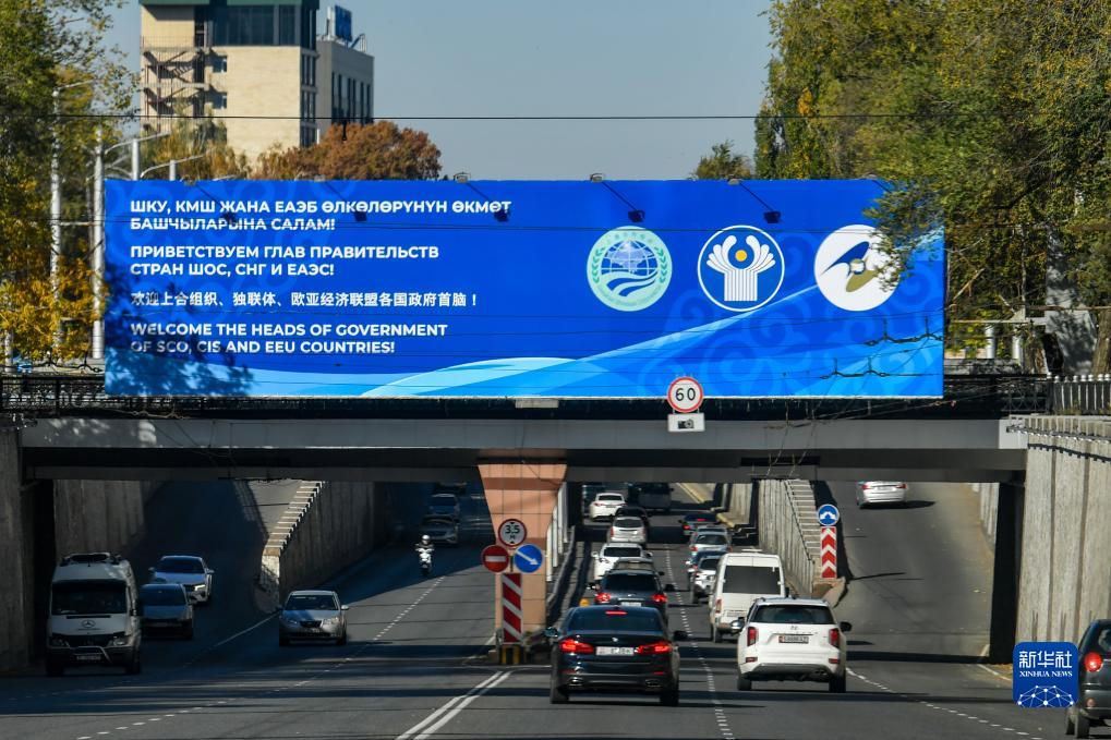 這是10月25日在吉爾吉斯斯坦首都比什凱克拍攝的上合組織標語。