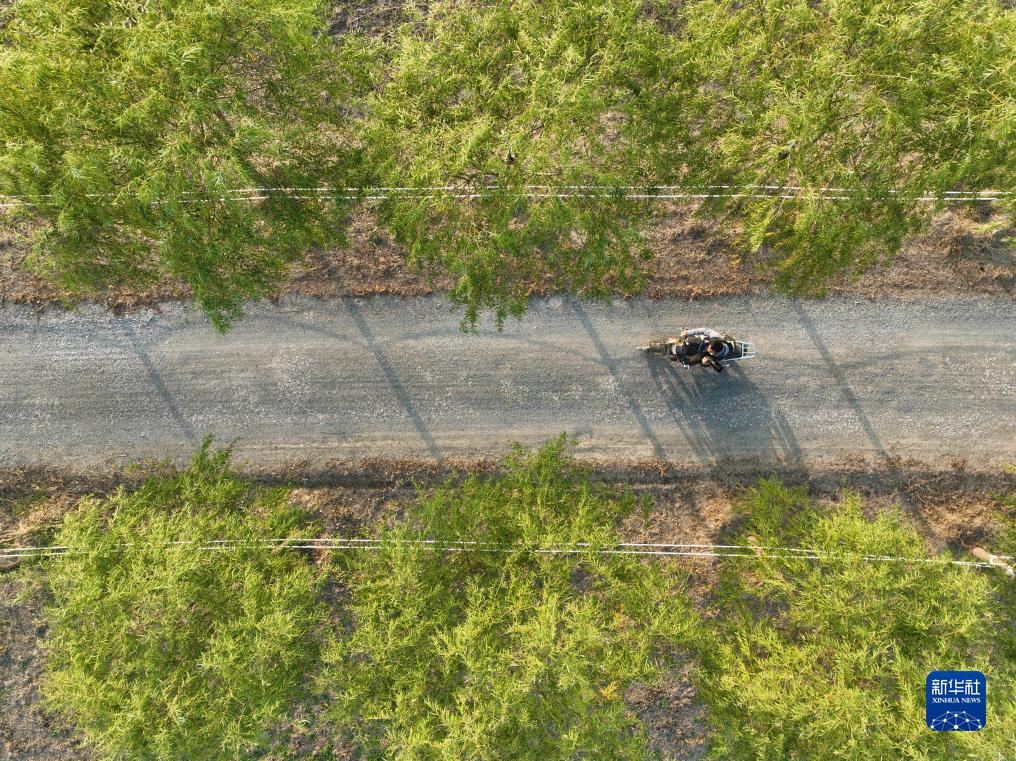 10月24日,韓戰橋在雄安新區孝義河河口濕地騎摩托車巡護(無人機照片)。