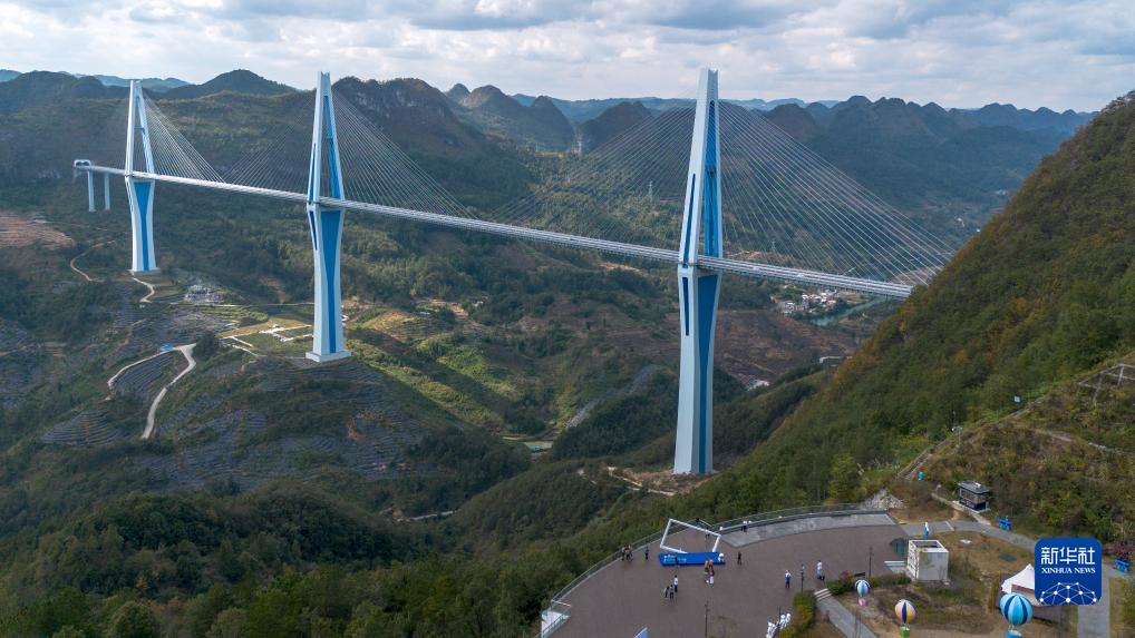 10月25日,游客在貴州省平塘縣“天空之橋”觀光服務區游玩(無人機照片)。