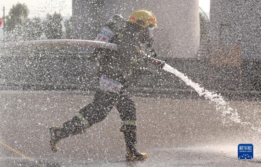 10月25日,消防員在閉幕式上演示槍炮協同滅火。