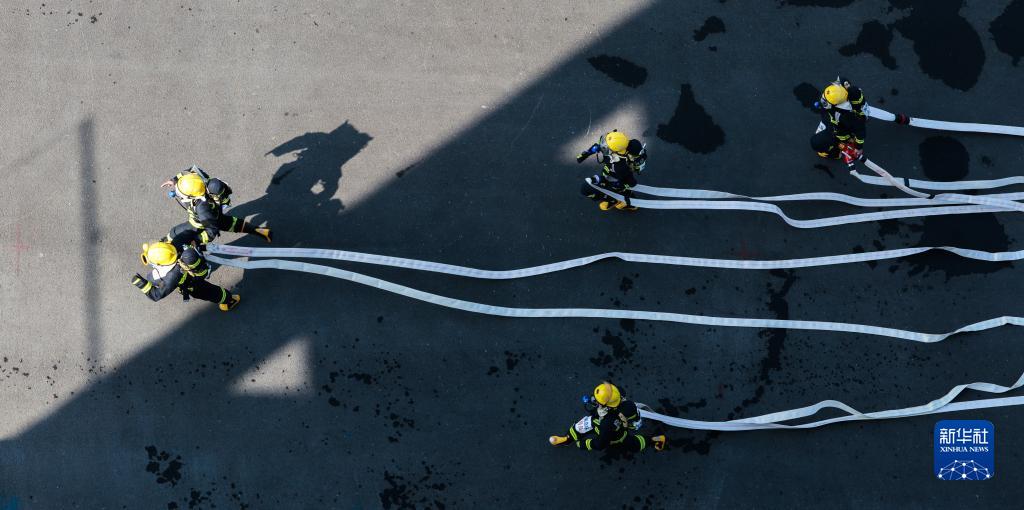 參賽選手在進行槍炮協同滅火項目比武(10月22日攝)。