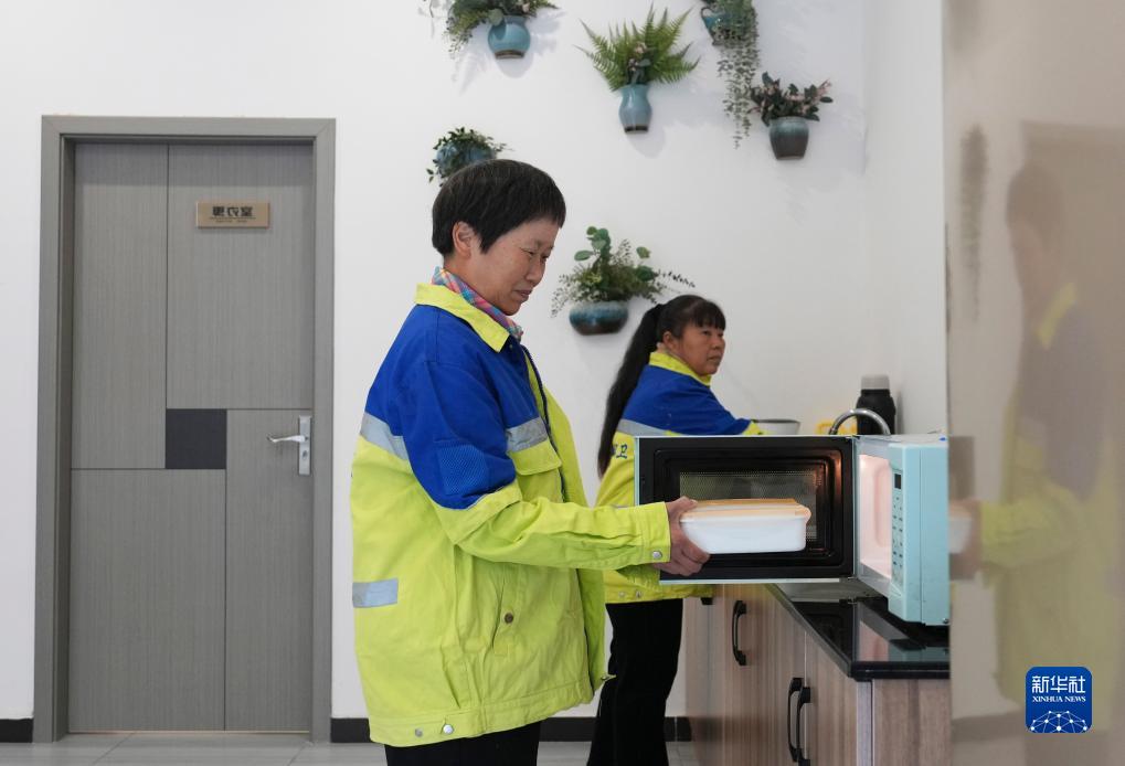10月25日,在重慶市北碚區云清路“勞動者港灣”,一名環衛工人使用微波爐加熱午飯。
