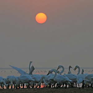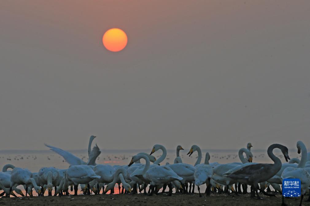 當日,在山東省榮成市天鵝湖,天鵝沐浴晨光,與湖光山色構成詩情畫意的美景。