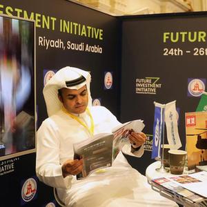 10月24日,在沙特阿拉伯首都利雅得,人們在第七屆沙特“未來投資倡議”大會會場通過大屏幕觀看開幕式。