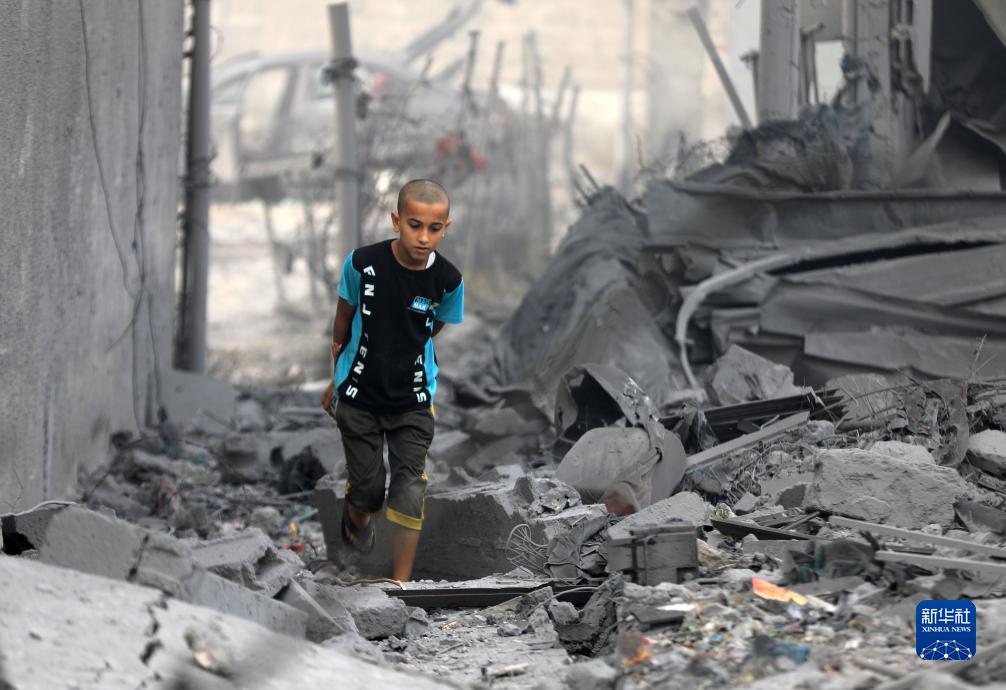 10月25日,在加沙地帶南部城市汗尤尼斯,一名男孩穿過一片建筑廢墟。