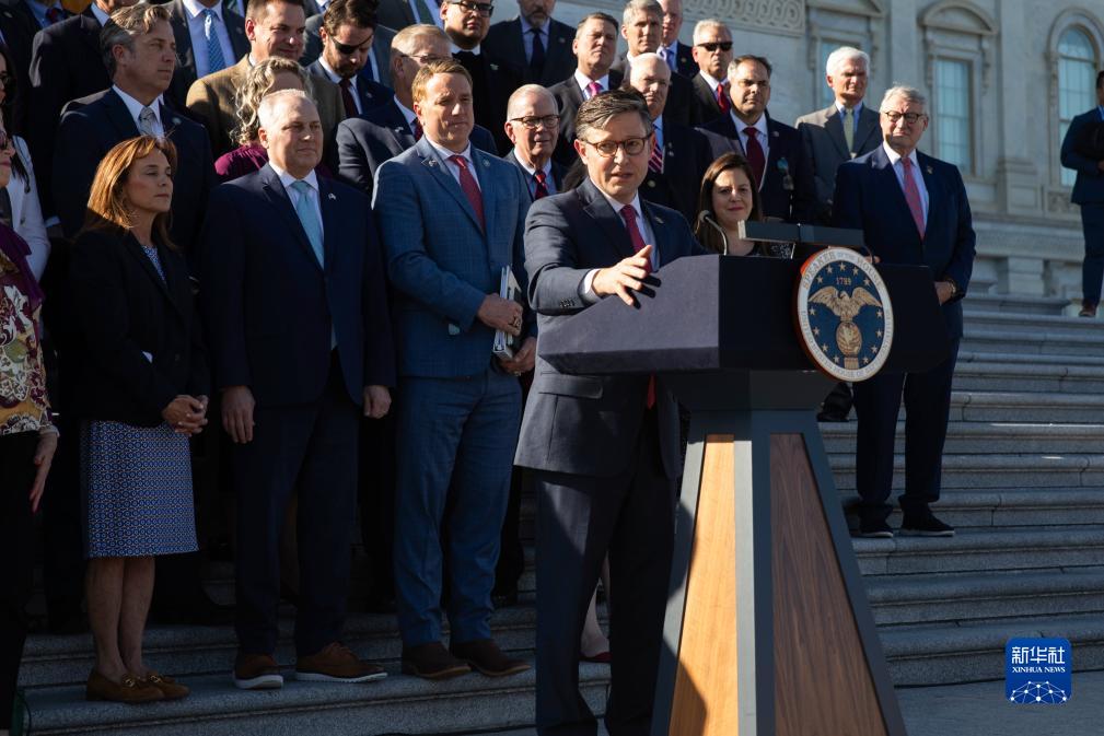 10月25日,在美國華盛頓國會外,新當選的眾議院議長邁克·約翰遜(前)發表講話。