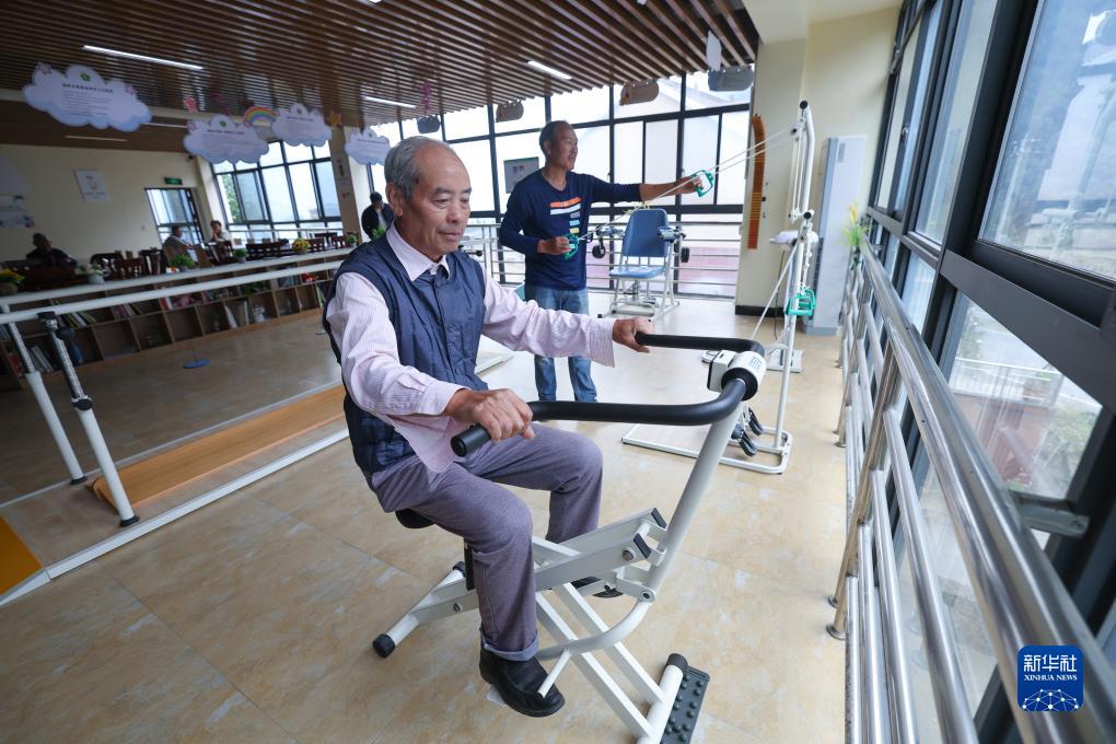 10月26日,在杭州市富陽區湖源鄉居家養老服務中心,老人們使用健身器材鍛煉身體。