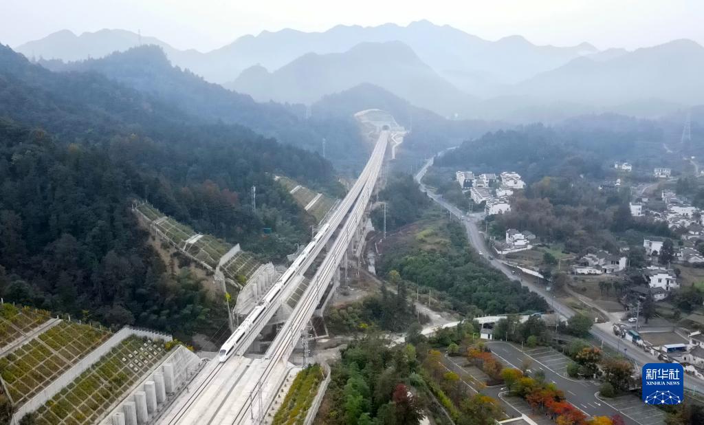10月26日,試運行列車行駛在昌景黃高鐵線上(無人機照片)。