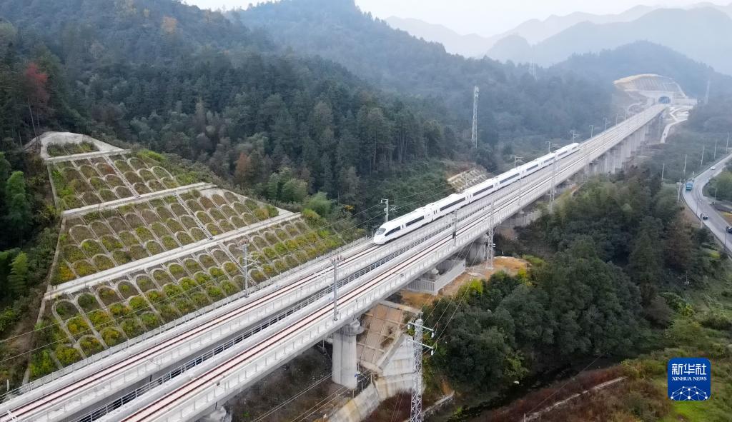 10月26日,試運行列車行駛在昌景黃高鐵線上(無人機照片)。