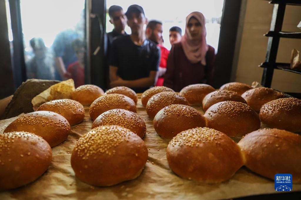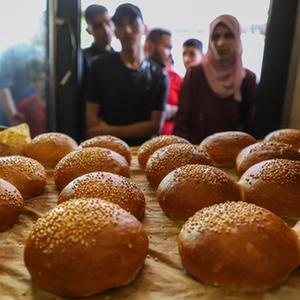 10月25日,在加沙地帶南部城市汗尤尼斯,人們在一家烘焙店外排隊購買面包。